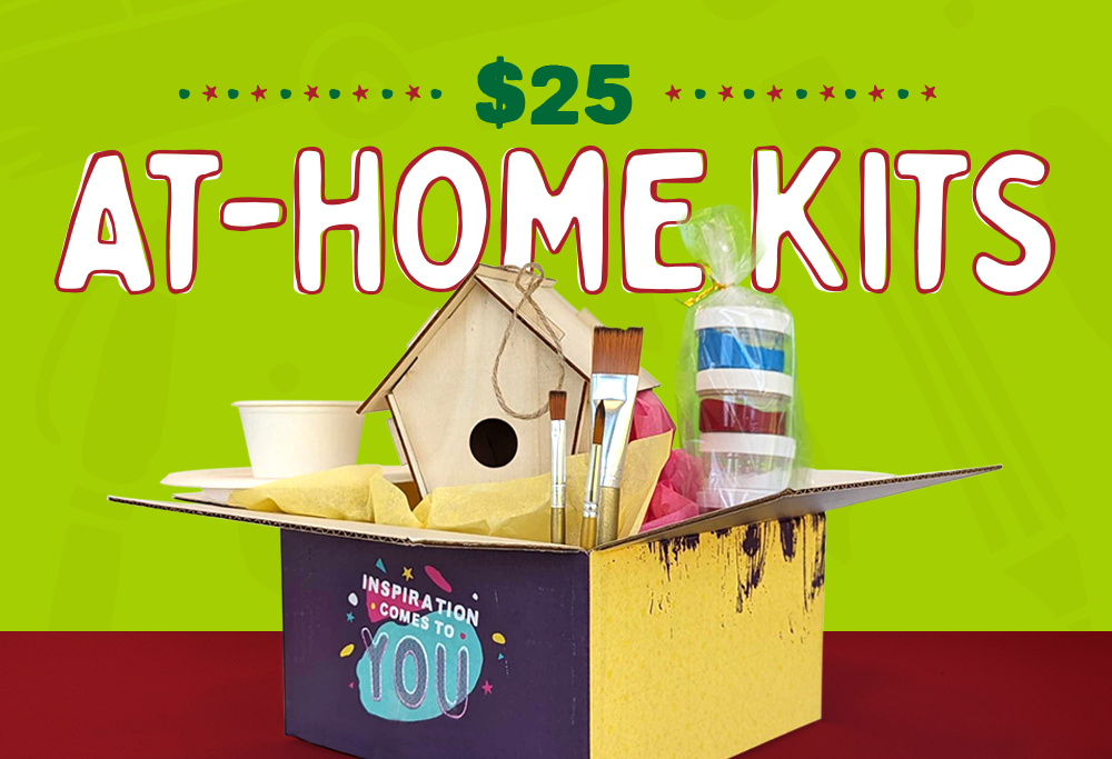 Need a last-minute gift idea? Our Studio Gift Cards are the perfect stocking stuffer. If you'd rather keep the little ones entertained without leaving the house then try our At-Home Kits. Each kit includes a paint or craft activity, brushes, acrylic paints, a paint palette, a water cup, and endless possibilities.